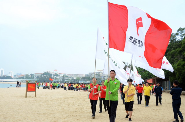 活動(dòng)啟動(dòng)儀式上,集團(tuán)公司黨委副書記、工會(huì)主席陳偉彬代表集團(tuán)領(lǐng)導(dǎo)班子向共建單位代表及全體員工致以節(jié)日的問(wèn)候!陳副書記表示,我們要尊重勞動(dòng)、謳歌勞動(dòng)者;我們要倡導(dǎo)運(yùn)動(dòng),褒獎(jiǎng)優(yōu)勝者;我們崇尚遠(yuǎn)大的理想,憧憬美好的未來(lái)。海軍南方局李躍峰副政委對(duì)象嶼集團(tuán)在勇?lián)鐣?huì)責(zé)任、傳承愛(ài)心善行方面所作的努力高度贊揚(yáng),并表示這對(duì)深入培育當(dāng)代革命軍人核心價(jià)值觀方面具有十分積極的推動(dòng)促進(jìn)作用。隨后進(jìn)行了“象嶼集團(tuán)縱走俱樂(lè)部”授旗儀式,集團(tuán)總裁張水利為縱走俱樂(lè)部授旗,號(hào)召更多縱走愛(ài)好者“走在一起,樂(lè)在一起”!集團(tuán)及海軍南方局領(lǐng)導(dǎo)、十佳員工及志愿者代表鳴槍發(fā)令,全體人員在司旗的帶領(lǐng)下,向著音樂(lè)廣場(chǎng)出發(fā)了!