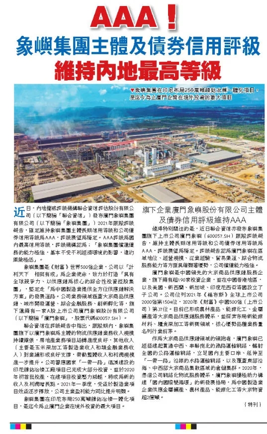 旗下企業(yè)廈門象嶼主體及債券信用評(píng)級(jí)維持AAA