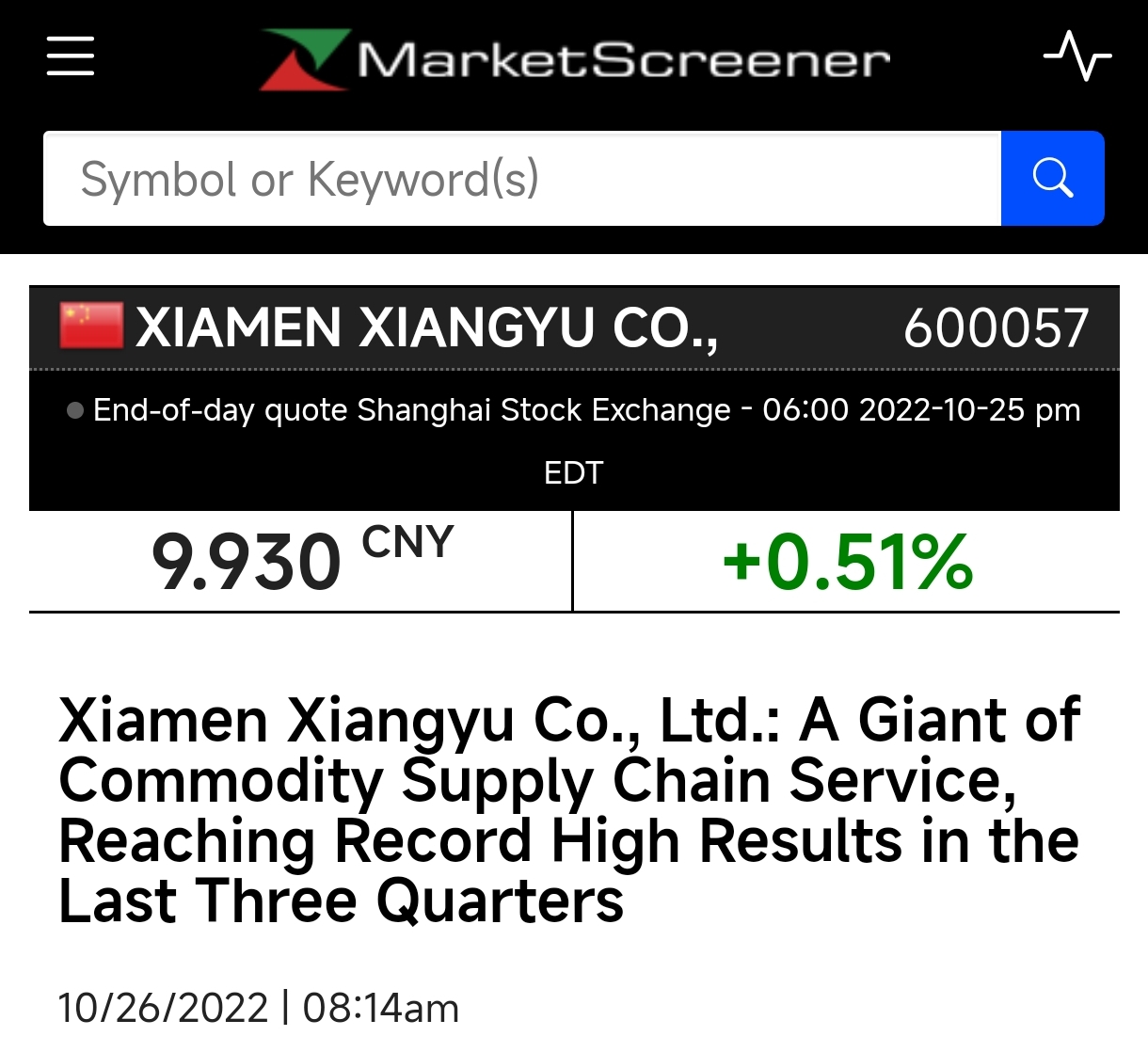 10月26日晚間,廈門象嶼(600057.SH)發(fā)布第三季度財報,2022年前三季度,公司實現(xiàn)營業(yè)收入3,918億元,同比增長13.74%;歸母凈利潤21.73億元,同比增長31.23%;凈資產收益率15.26%,同比增加1.91個百分點。公司營業(yè)收入、歸母凈利潤均創(chuàng)同期歷史新高,經營效益持續(xù)提升。